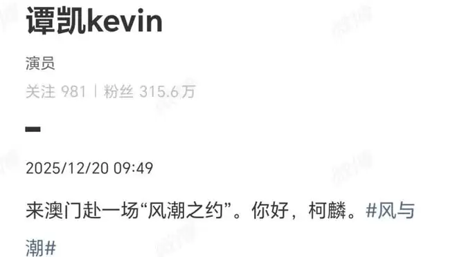 澳门回归26周年,谭凯写道:来澳门赴一场“风潮之约”。你好,柯麟。