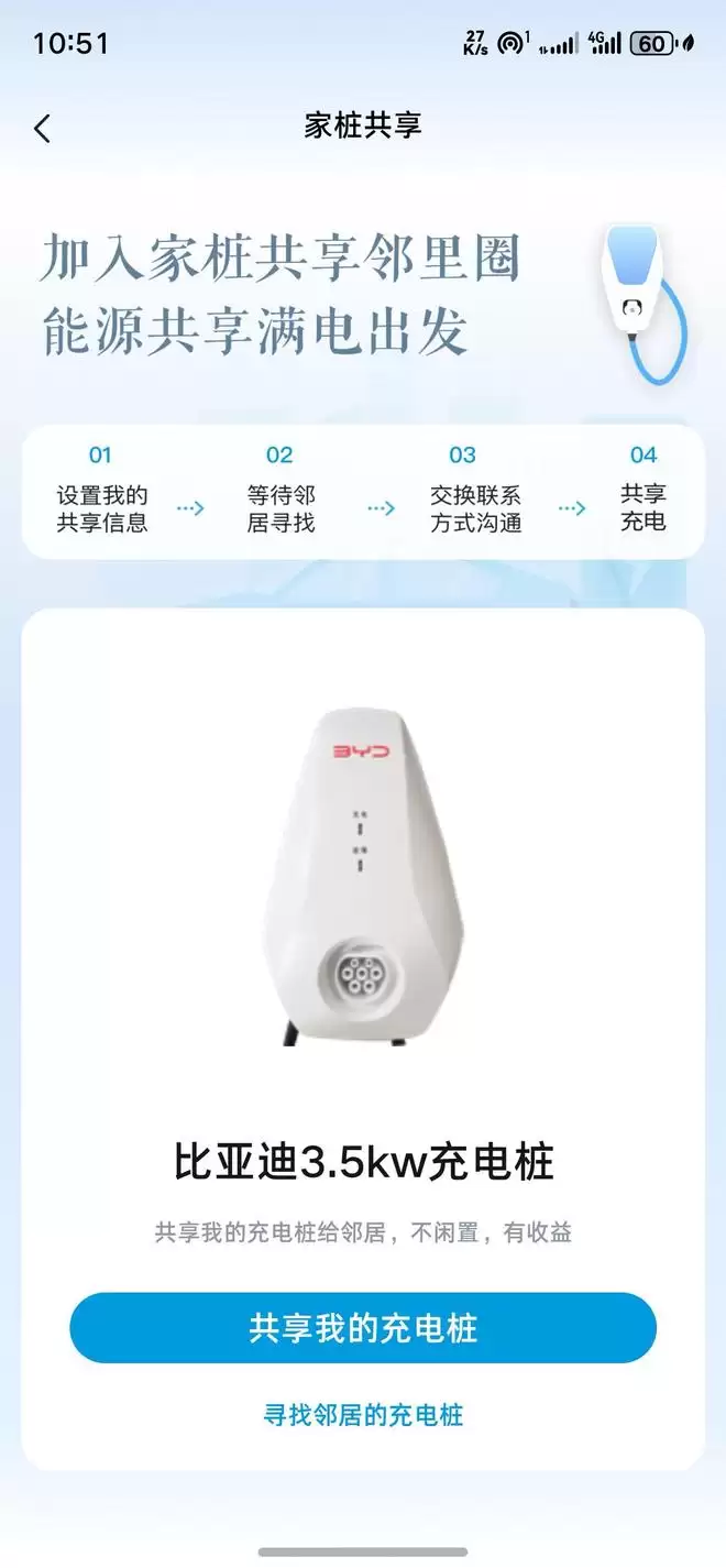 打开比亚迪App服务页面,找到“家桩服务”,设置我的社区,即可寻找邻居的充电桩,交换联系方式沟通共享充电。