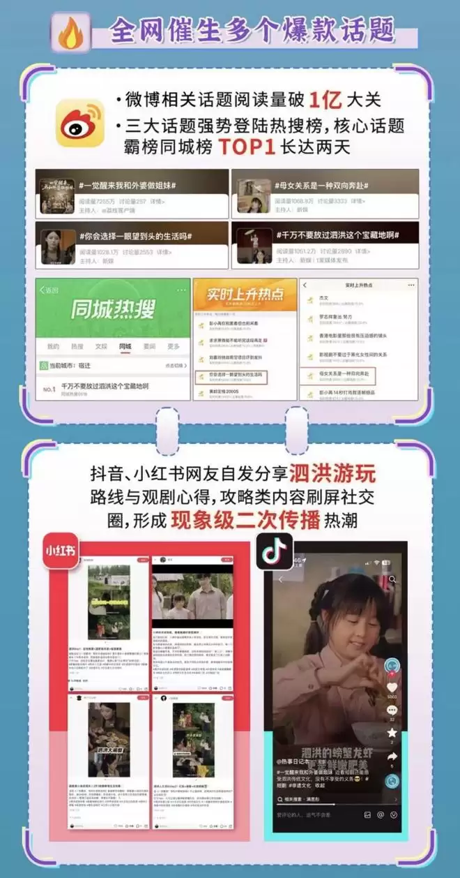 拍摄期间,主创团队推出“网红”式转场视频、非遗拍摄特辑、蟹塘农事体验幕后等特色物料,全网话题热度持续攀升,实现“未播先火”的传播效应。上线首日便登顶红果短剧新剧榜榜首并获“大视听”频道大图重点推荐。获得国家广播电视总局主管的综艺报、光明网等逾百家主流媒体与行业平台联合报道,省广电局公众号、省农业农村厅抖音账号重点安利;全网传播热度爆棚,微博相关话题阅读量破1亿,三大话题榜TOP1长达两天,抖音、小红书网友自发分享泗洪游玩路线形成现象级二次传播潮,泗洪达人参演Vlog也引发圈层热议。同时作品实现流量口碑双告捷,以真情实感引发全民共情,还通过剧情造热点、活动揽流量、体验留人心的方式,完成线上关注到线下客流的高效转化,成为兼具讨论度与传播力的热门短剧。