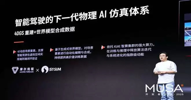 12月20日,在摩尔线程MUSA开发者大会主题演讲中,公司创始人、董事长兼CEO张建中深入分享了摩尔线程与五一视界(51WORLD)旗下仿真平台51Sim围绕KUAE计算集群,携手构建新一代物理AI仿真体系的重要进展。双方基于国产GPU大规模算力,融合新一代仿真与世界模型技术,共同探索端到端智能驾驶、具身智能等前沿领域的物理AI基础设施建设路径。