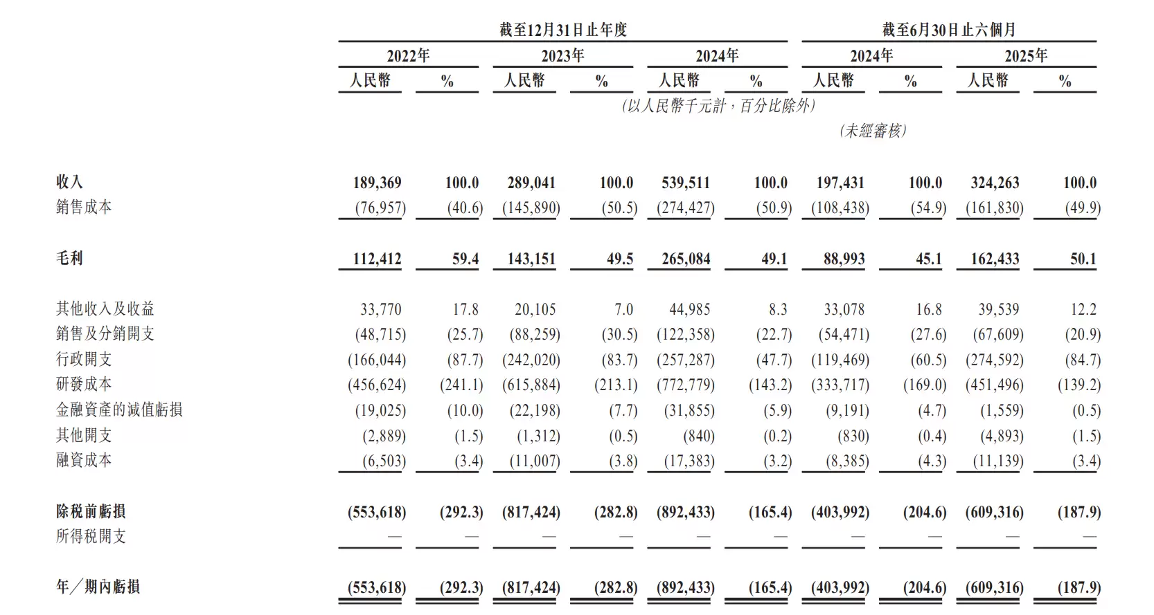 招股书显示,2024年、2024年、2024年,公司的研发投入分别为约4.56亿元、6.16亿元、7.73亿元,分别占同年总营收的241.1%、213.1%、143.2%。2025年上半年,公司的研发投入约为4.51亿元。