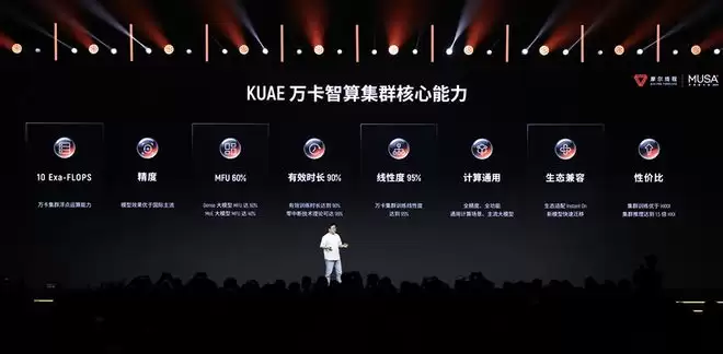 浮点运算能力达到10EFLOPS在多项关键精度指标上,模型效果达到国际主流水平;训练算力利用率(MFU)在Dense大模型上达60%,MOE大模型上达40%有效训练时间占比超过90%训练线性扩展效率达95%计算通用;与国际主流生态高度兼容;在多项指标上具备显著能效和性价比优势。