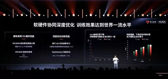 同时,通过软硬协同深度优化,摩尔线程完整复现DeepSeek V3的FP8训练,自研FP8 GEMM通过精细化优化,算力利用率高达90%;通过极致算子性能优化,Flash Attention的算力利用率超95%。在展示的案例中,MTT S5000集群实现了比国际主流计算卡更好的DeepSeek训练效果。