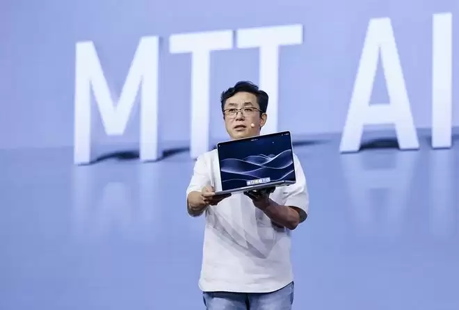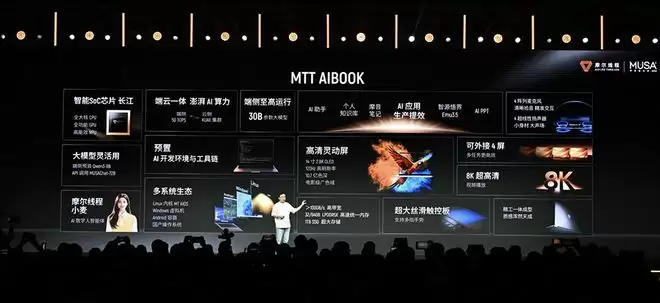 面向端边侧,张建中现场展示了搭载“长江”SoC芯片的第一台AI算力本MTT AIBOOK。
