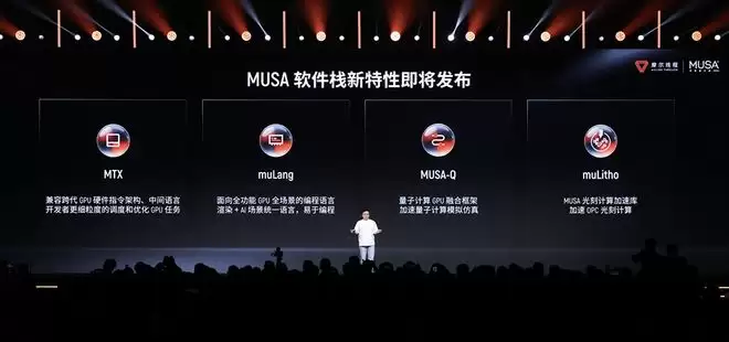(4)即将推出四大基础库:兼容跨代GPU指令架构的中间语言MTX、面向渲染+AI融合计算的编程语言muLang、量子计算GPU融合框架MUSA-Q、加速OPC光刻计算的计算光刻库muLitho。