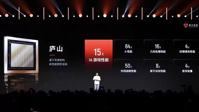 庐山芯片专攻高性能图形渲染,相比MTT S80,3A游戏性能提升至15倍,AI计算性能提升64倍,几何处理性能提升16倍,光线追踪性能提升50倍,显存容量提升4倍,并显著增强纹理填充、原子访存能力;集成AI生成式渲染、UniTE统一渲染架构及全新硬件光追引擎。