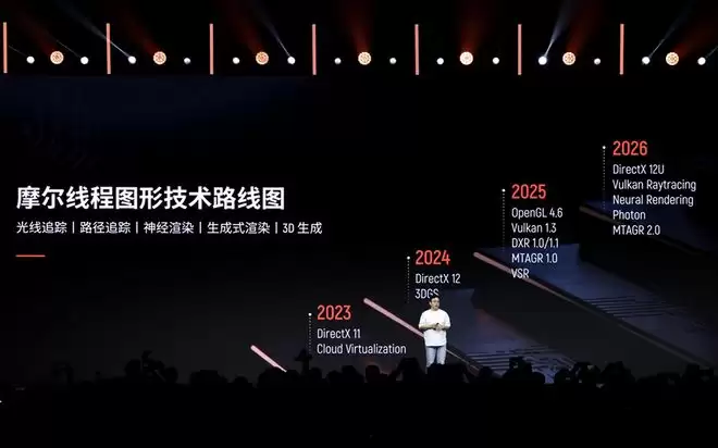 摩尔线程还披露了图形技术路线图:率先拥抱“图形+AI”,实现硬件级光线追踪加速。