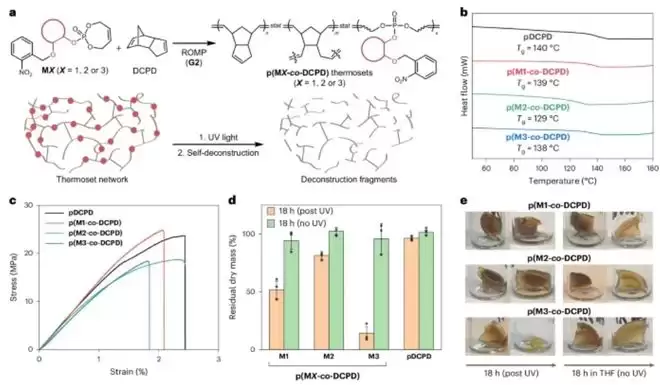 随后,殷绍峥将这一概念成功拓展到一种典型却难以降解的材料——聚双环戊二烯(polydicyclopentadiene)中。在他的工作下,这种原本几乎不可降解的材料实现了可控的自降解。更进一步,研究团队在仿生基础上超越自然,设计出了降解速度快到几小时内就能完全分解的超快速自降解材料。