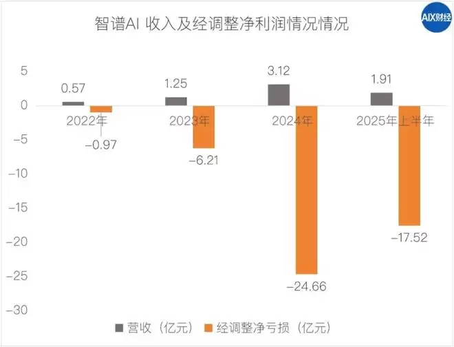 排名背后,另一组数字同样醒目。2024年,智谱AI经调整净亏损达24.7亿元。2025年上半年亏损仍在加剧,营收1.9亿元对应经调整净亏损17.5亿元。