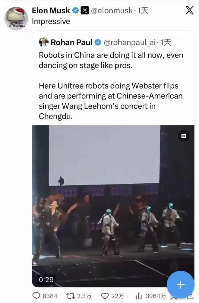 马斯克点赞:宇树机器人伴舞视频引爆关注