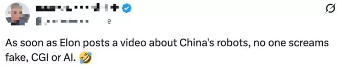 在马斯克的帖子下,还有网友打趣道:“一旦马斯克发布关于中国机器人的视频时,就没人会喊这是AI合成的了。”