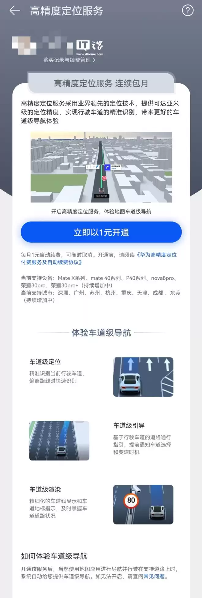 据介绍,华为手机的高精度定位服务基于实时动态差分技术,能够提供比传统GNSS定位更高的精度。用户开通服务后,在使用地图应用进行导航并行驶在支持的道路上时,地图应用将自动启用高精度定位服务。若用户开通了高精度定位服务的连续包月套餐,系统将在每个月的有效期结束前一天自动扣费,费用为每月1元。