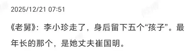 李小珍对崔国明感情如此之深,对崔国明事事包容,难怪有观众说李小珍有5个孩子,而第5个就是崔国明。