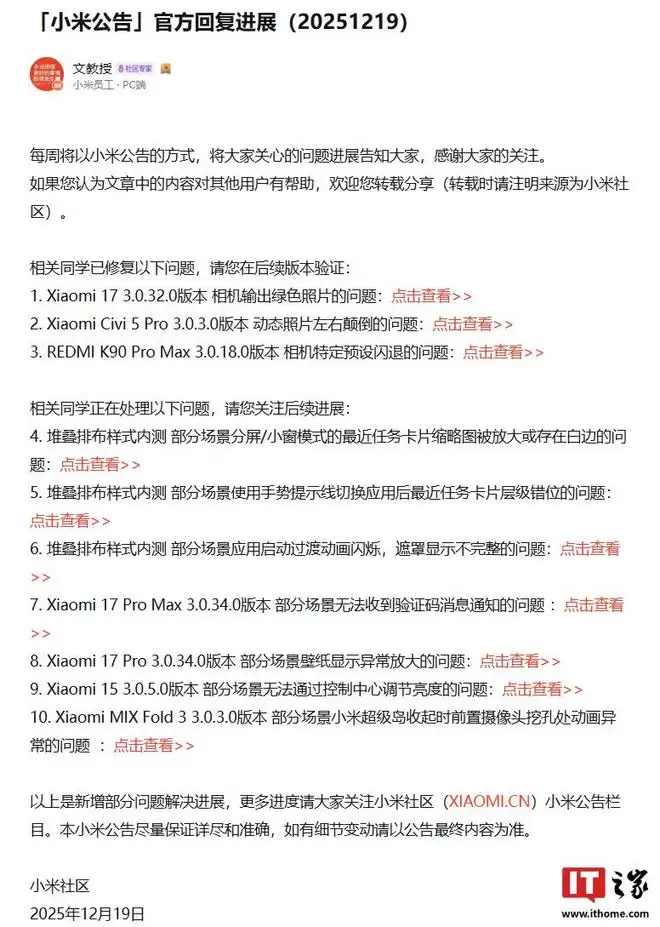 12月21日,IT之家从小米社区获悉,小米员工本周更新了澎湃HyperOS的最新优化进展。其中提到,用户反馈的Xiaomi 17在3.0.32.0版本出现的相机输出绿色照片问题已得到优化,可在后续版本中验证。此外,小米最新还定位到了Xiaomi 17 Pro系列机型存在的相关问题。