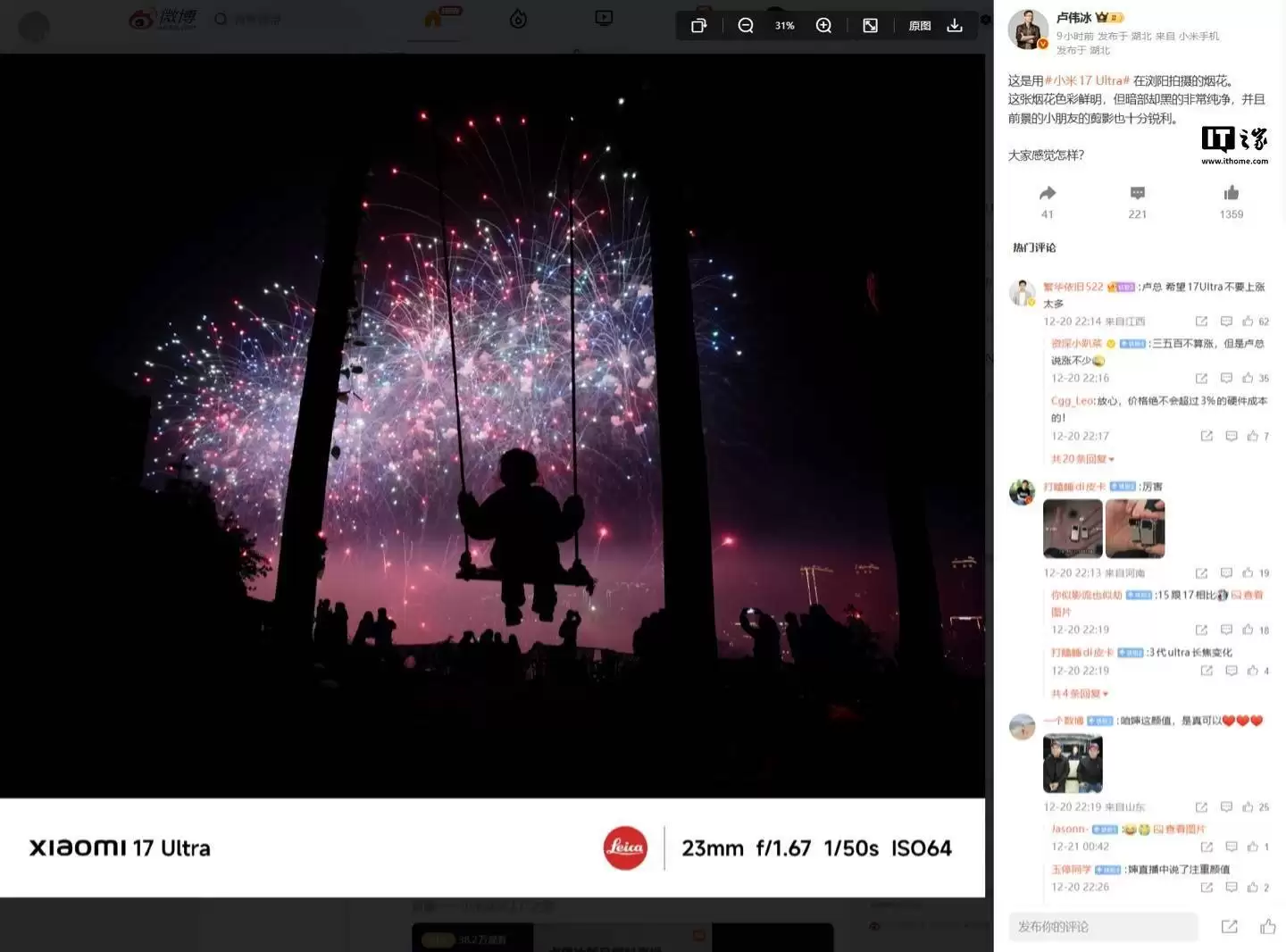 小米集团合伙人、总裁兼手机部总经理卢伟冰近日在社交平台分享了小米14 Ultra的首张实拍样张。这张由新机在浏阳拍摄的烟花照片广受关注,画面中绽放的烟花色彩饱和、亮度极高,暗部区域却呈现出深邃纯净的黑色,前景中孩童的剪影轮廓清晰锐利,整体成像效果展现出专业摄影设备的质感。