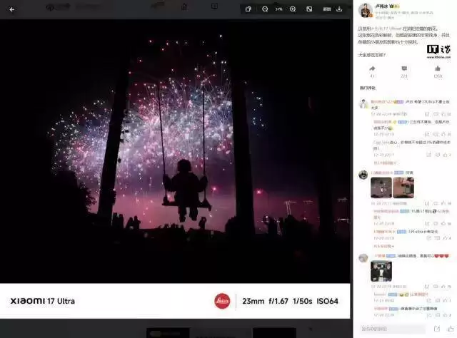 该机长焦镜头通过了徕卡APO认证,可显著减少紫边与绿边现象,画面锐度与清晰度进一步提升。卢伟冰特别强调,在徕卡镜头体系中,APO认证代表着顶尖光学素质。直播中还首次公开了使用小米17 Ultra拍摄的样张——在浏阳拍摄的烟花场景中,画面色彩层次分明,暗部纯净度极高,前景人物剪影边缘锐利,展现出强大的影像实力。
