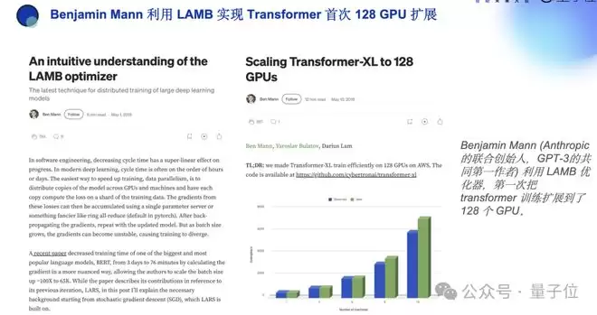 世界上最顶尖的专家之一,Benjamin Mann(Anthropic的联合创始人,GPT-3的共同第一作者),他在2019年使用LAMB,首次把Transformer训练扩展到128个GPU。