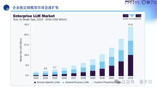 领域大模型未来到2033年的时候是最大的,大概占40%的市场份额;通用大模型ChatGPT或者豆包或者Gemini占30%;私有大模型也能占到30%。