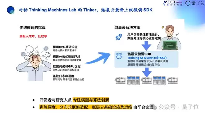 刚才提到目前业界龙头是Thinking Machines Lab的Tinker,潞晨打造了一个类似的产品,潞晨云的微调SDK