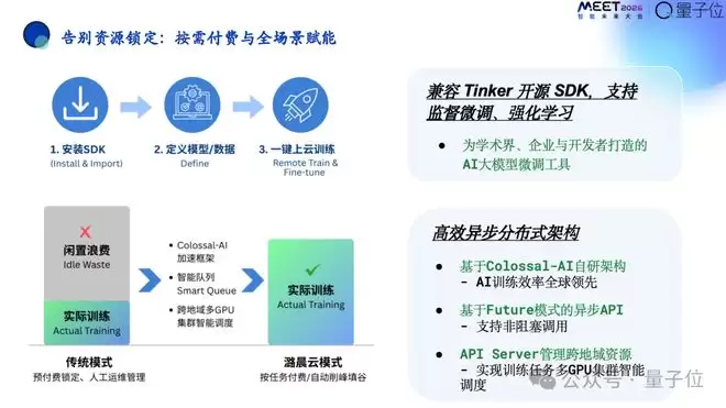 这是整个流程,通过这种方式按照SDK定义一下模型和数据一键式在云上训练部署,这样也能兼容Tinker的各种开源的SDK,实现监督微调、强化学习等。背后也集成了潞晨对算力性能优化的工具Colossal-AI来帮助用户降低成本。