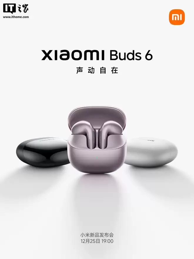 12月22日,据IT之家报道,小米官方宣布其新款旗舰半入耳式TWS耳机——小米Buds 6,将于12月25日晚正式亮相。官方海报同时揭晓了耳机的三款配色方案。
