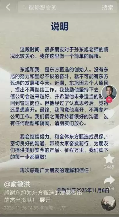 来到2025年,最近离开的核心人物是当年为新东方立下过汗马功劳的联合创始人孙东旭。俞敏洪一如既往的表达了感谢,送出了祝福。