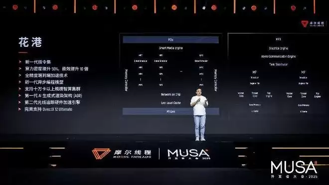 本次大会的核心亮点之一,是摩尔线程重磅发布的新一代GPU架构“花港”。作为驱动千行百业数智化转型的核心引擎,新架构在计算密度、能效、精度支持、图形技术等方面实现了全面突破,相较于前代产品展现出显著的技术优势。