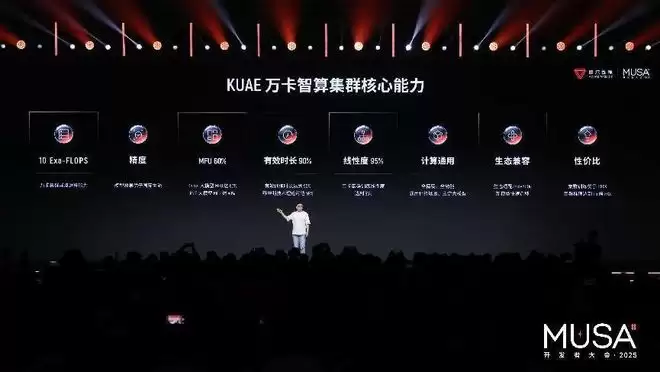 经过摩尔线程的深入开发,目前夸娥万卡智算集群有效解决了上述难题,具备了全精度、全功能通用计算能力,在万卡规模下实现高效稳定的AI训练与推理。根据张建中的介绍,夸娥万卡智算集群取得多个核心突破:浮点运算能力达到10Exa-Flops,训练算力利用率(MFU)在Dense大模型上达60%,MOE大模型上达40%,有效训练时间占比超过90%,训练线性扩展效率达95%,与国际主流生态高度兼容,并在多项指标上具备显著能效优势。
