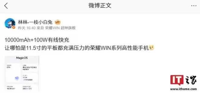 这一数据的量级,在以往通常属于平板电脑的配置范畴。早在 12 月 18 日,荣耀中国区智慧生活业务部部长林林便在社交媒体上暗示:“10000mAh+100W 有线快充,让哪怕是 11.5 寸的平板都充满压力的荣耀 WIN 系列高性能手机。”这一言论在当时引发了业界的广泛热议。