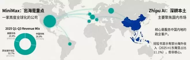 智谱AI则主要聚焦国内市场,虽然其招股书显示有部分海外收入(2025H1东南亚占比11.1%),但核心仍是服务中国內地的政企客戶。