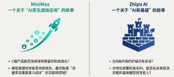 MiniMax叙事:这是一个关于“AI原生超级应用”的故事。投资者需判断其C端产品能否持续保持高留存,以及其模型推理效率能否持续领先,最终跑通“流量变现覆盖算力成本”的互联网逻辑。