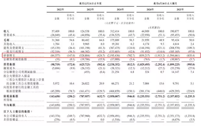 2025年上半年,智谱AI的营收为1.91亿元,但同期研发开支高达15.95亿元。这意味着每赚1块钱,就要投入超过8块钱进行研发,研发费用率高达835.4%。这种“超饱和”投入主要用于算力服务费(11.45亿元)及研发人员薪酬,显示出智谱在追赶SOTA(当前最佳)模型能力上的坚定决心。