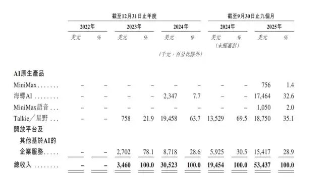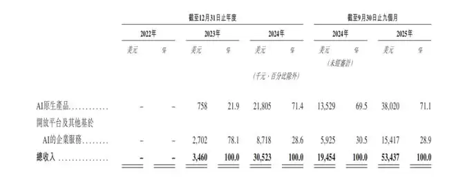 MiniMax招股书显示,“AI原生产品”是其绝对支柱。2024年该板块收入仅75.8万美元,而到了2024年飙升至2180万美元,2025年前9个月更是达到3802万美元,占总收入的71.1%。