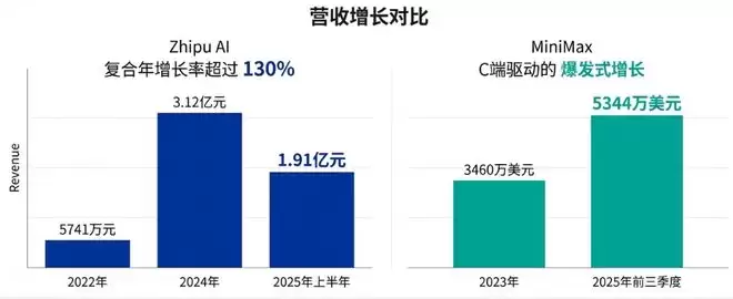 招股书显示,2024年至2024年,智谱AI收入分别为5741万元、1.25亿元及3.12亿元,复合年增长率超过130%。截至2025年6月30日止六个月,智谱AI 实现营收1.91亿元