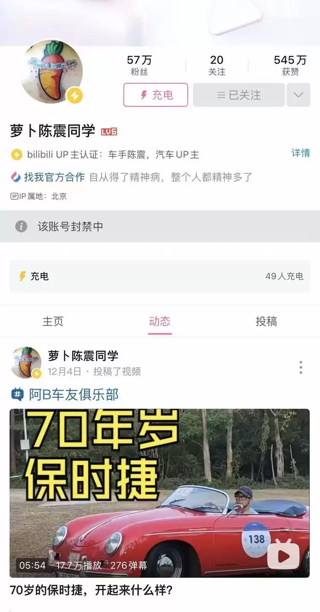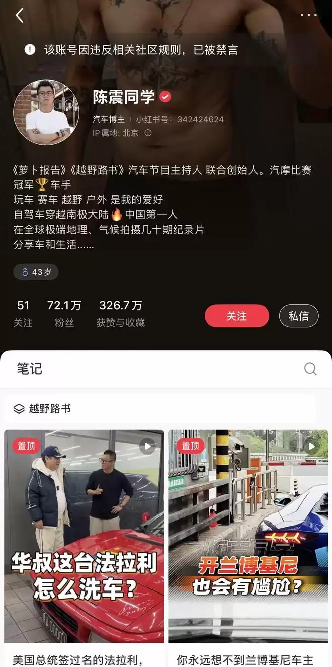 12月22日,三言注意到,陈震的社交平台小红书的账号在短暂解封后,其B站账号目前再次遭到封禁。