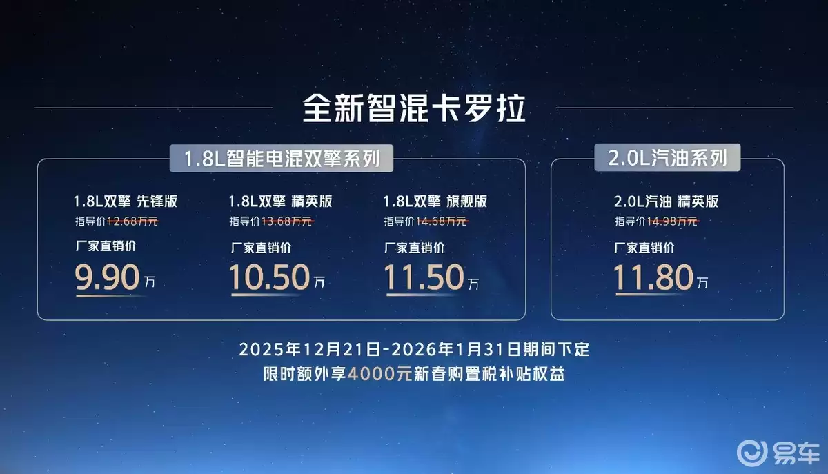 一汽丰田近日推出了全新智混卡罗拉,标志着这款经典家用轿车迎来了第十二代彻底革新。新车提供了四款配置,涵盖智能电混双擎与纯燃油动力系统,官方指导价区间为9.99万元至11.89万元。从即日起到2026年1月31日期间下订的用户,还可以额外获得4000元的新春购车补贴。