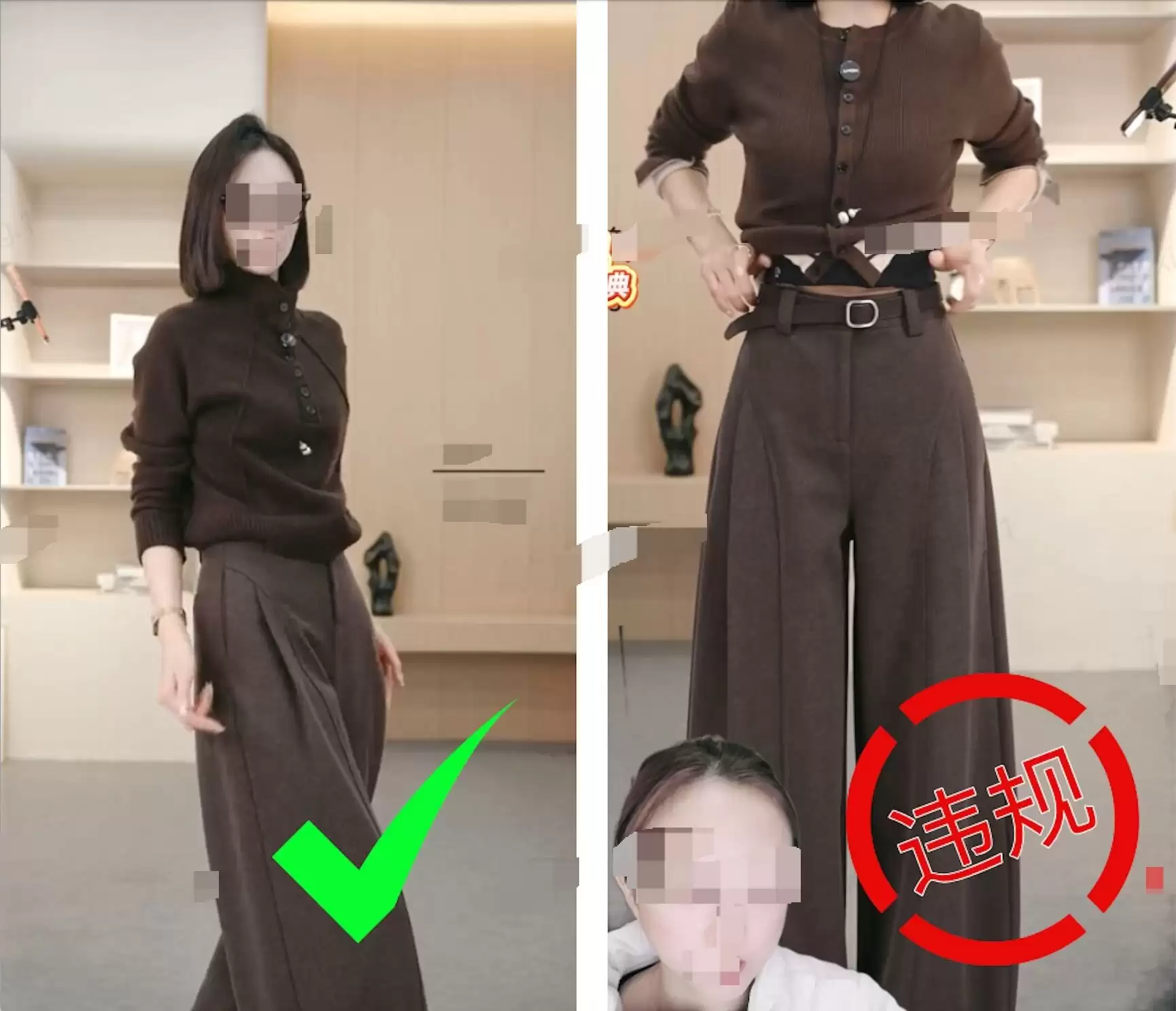 “X******装”等达人盗用他人的直播片段,通过裁剪、画面反转、加特效等方式进行作弊,最终以真人不露脸的方式售卖商品。根据相关规则,平台已中断其盗播直播间。