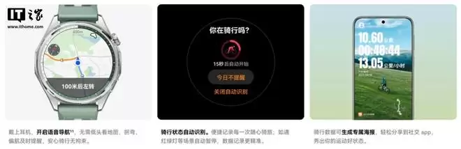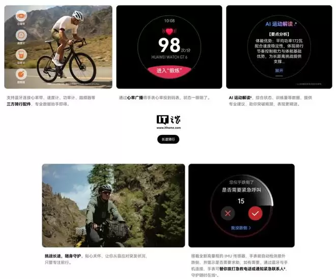 HUAWEI WATCH GT 6 支持蓝牙连接心率带、速度计、功率计、踏频器等三方骑行配件,可通过心率广播将手表心率投到码表。同时,HUAWEI WATCH GT 6 还支持 AI 运动解读,包含综合状态、训练量等数据,并提供专业建议。