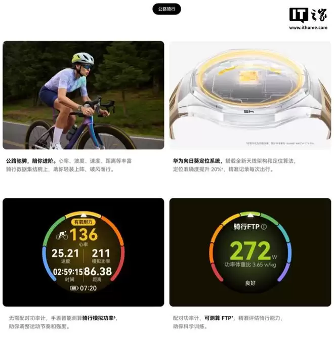 HUAWEI WATCH GT 6 内置华为向日葵定位系统,搭载全新天线架构和定位算法,定位精准度提升 20%;手表无需配对功率计,可智能测算骑行模拟功率,调整运动节奏和强度;配对功率计和测算 FTP,精准评估骑行能力。