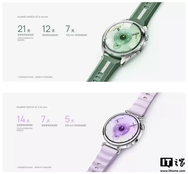 作为参考,HUAWEI WATCH GT 6 标准版提供 41mm 和 46mm 两种尺寸,满足不同佩戴需求。41mm 版本引入回环型灵动表耳、精致表冠,配备 1.32 英寸屏幕,续航最长 14 天。46mm 版本采用升级的高硅堆叠电池,容量比上一代提升 65%,配备 1.47 英寸屏幕(3000 尼特峰值亮度),续航可达 21 天。
