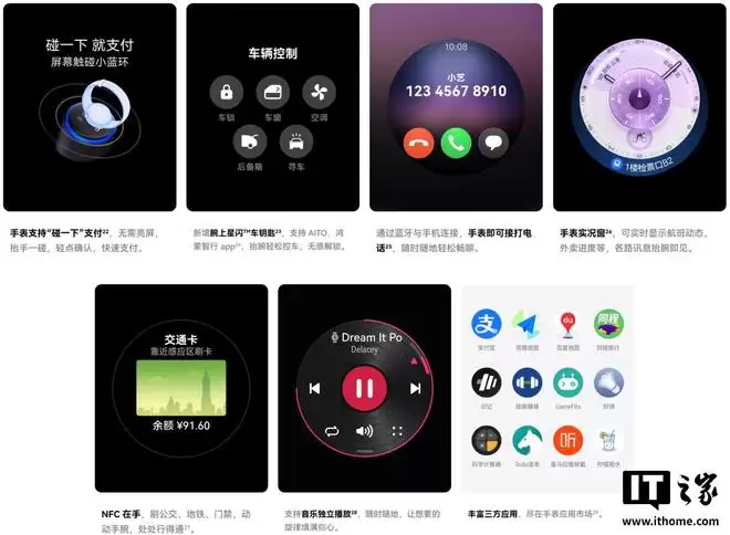 HUAWEI WATCH GT 6 智能手表还支持支付宝碰一碰支付、腕上星闪车钥匙、蓝牙接打手机电话、手表实况窗、交通卡、音乐播放、第三方 App 安装使用等。