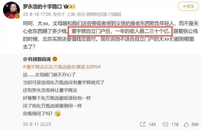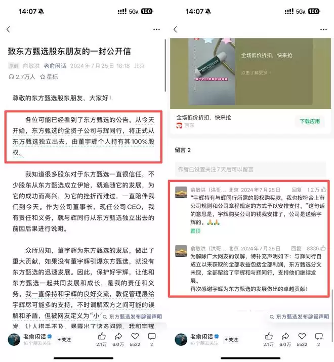 呐,小雷在俞敏洪的微信公众号找到了当时的公开信。他在评论区给大家说了大白话:宇辉买公司的钱我安排的(公司是送给宇辉的)、与辉同行的收益和利润全部留给了宇辉,东方甄选和我都没拿。