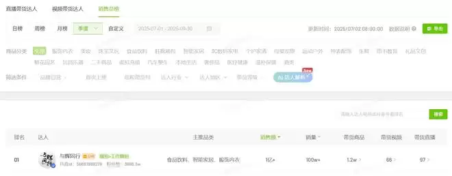 回看董宇辉这边,与辉同行做得真的很不错。小雷到飞瓜平台看了一下带货达人榜,与辉同行守住了日榜、周榜、月榜、季度榜第一,稳坐销冠之位。