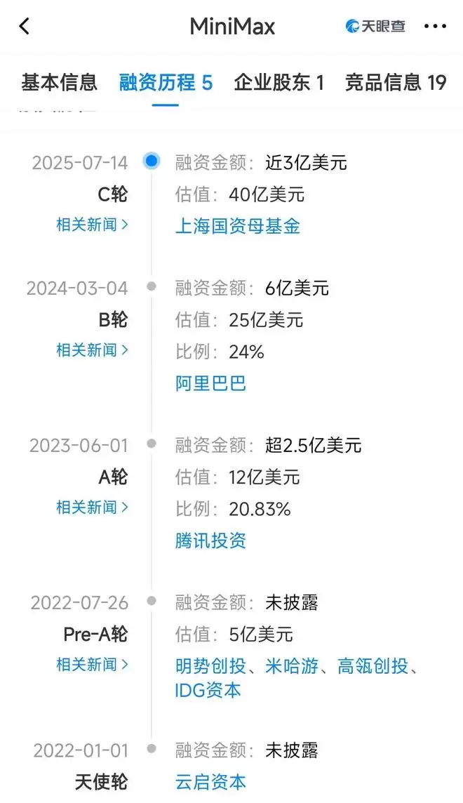 据天眼查,MiniMax坐拥豪华股东阵容,成立以来,MiniMax累计融资超15亿美元,战略投资人包括米哈游、阿里巴巴、腾讯、小红书、小米、金山、PCG和正大集团等;财务投资人包括高瓴资本、IDG、红杉、经纬、明势、云启资本等。