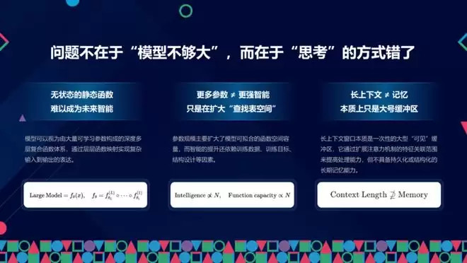 回到技术路线。当前大模型的发展仍以Transformer架构为主导。过去几年,焦点多集中于规模化训练——依赖更多数据、更大算力、更高人才密度,以打造更强大、更全能的模型。暂且不论这般投入是否存有泡沫,实际上,算力的增长正在扼杀创新,也令许多小团队失去机会。目前国内外大模型厂商基本都在拼资源。如果所有参与者都需要如此庞大的资源,创新将从何而来?当大家在同一条道路上愈行愈远,真正的问题在于:模型是否必须足够大?数据是否必须海量?我个人或许未曾读过上千本书,但这并不妨碍我今天在此分享观点,也不妨碍我从事AI行业。我必然没有一个大模型懂得多,它可能已遍览所有的书籍与资料,但人类的进化与工作方式并非如此。