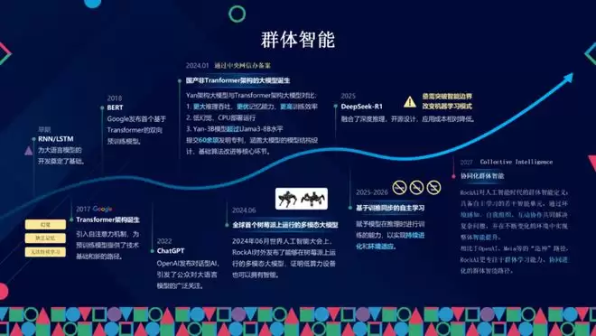 这张图包含的内容很多,但其核心想表达的是“群体智能”这四个字。这是我们公司以及学界部分专家认为更具可行性、方向更明确的一条路径。我们不确定一个拥有十几万亿参数的模型未来能否成为全面的“六边形战士”,但自然界已给了我们许多启示——比如人类和动物的群体协作。