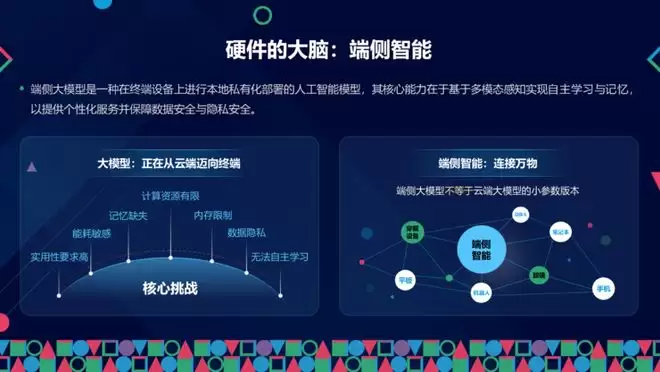 包括之前提及的家居场景,其实那个场景可能完全无需云端参与。正因如此,我们更关注端侧智能的发展。事实上,端侧智能今年已引起广泛关注,众多公司开始在此领域发力,大模型也逐渐从云端向端侧延伸。有消息称,OpenAI明年或将发布自有硬件,并与模型结合,甚至传言将训练小参数的模型直接部署于设备端。由此可见,端侧人工智能确实在持续演进。
