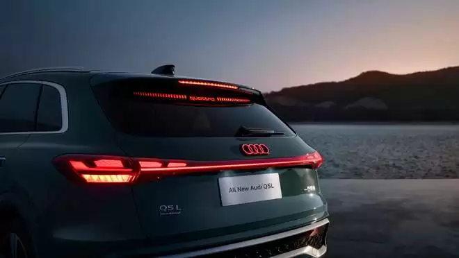 车尾部分,「灯厂」奥迪为全新 Q5L 带来了贯穿式的「龙鳞水韵尾灯」,并首次引入第二代数字 OLED 技术,支持自定义灯语显示。高配车型还搭载中国市场专属的投影式高位刹车灯,科技感与辨识度双双拉满。