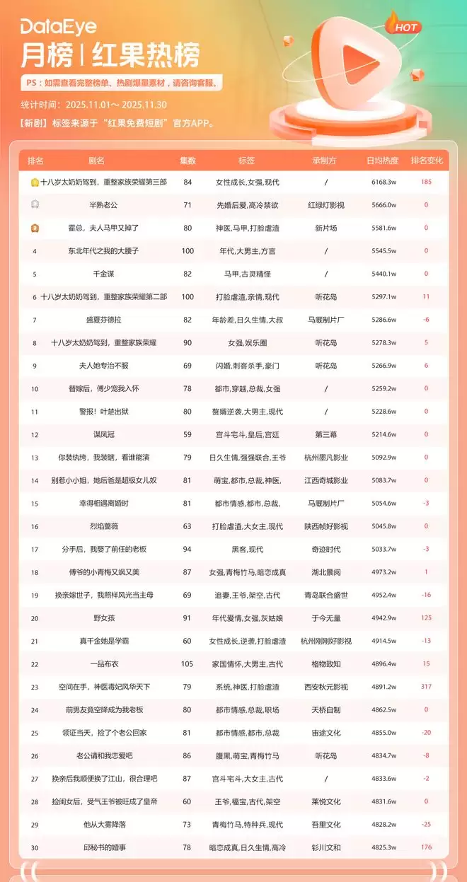 从热度来看,11月红果热榜月榜中,听花岛制作的《十八岁太奶奶驾到,重整家族荣耀第三部》第一,日均热度达6168.3W。《十八岁太奶奶驾到,重整家族荣耀第三部》10月26日上线,于10月28日登顶DataEye红果热榜日榜,热度达1.7亿。本期该剧持续霸榜,于11月1日达到本期热度峰值1.2亿。