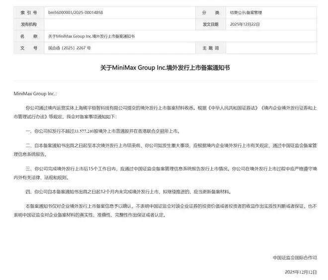 12月22日,中国证监会国际合作司公布了关于MiniMax Group Inc.境外发行上市的备案通知书。根据通知,该公司计划发行不超过33,577,240股境外上市普通股,并在香港联合交易所上市。